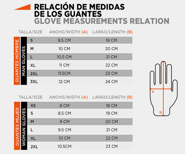 Storlekstabell för Seventy Mc-Sporthandskar SD-R12 med mått för herr- och damhandskar. Hjälper till att välja rätt storlek för optimal passform.