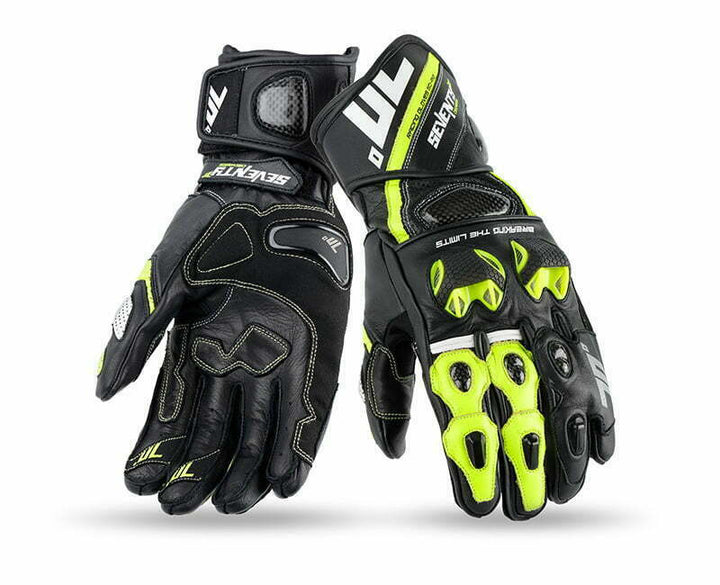 Seventy Mc-Sporthandskar SD-R12 Svart/Flu med skyddande knogar och förstärkt grepp. Perfekta för motorcyklister som söker säkerhet och komfort.