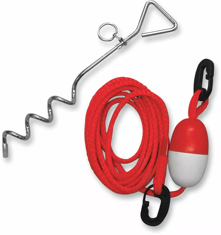 Includes 15 'Polypropylene Rope, Float and Two Plastic Snap Hooks, Galvanized Steel Anchor Stake Spirals Into Ground, not for use in sandy soils.