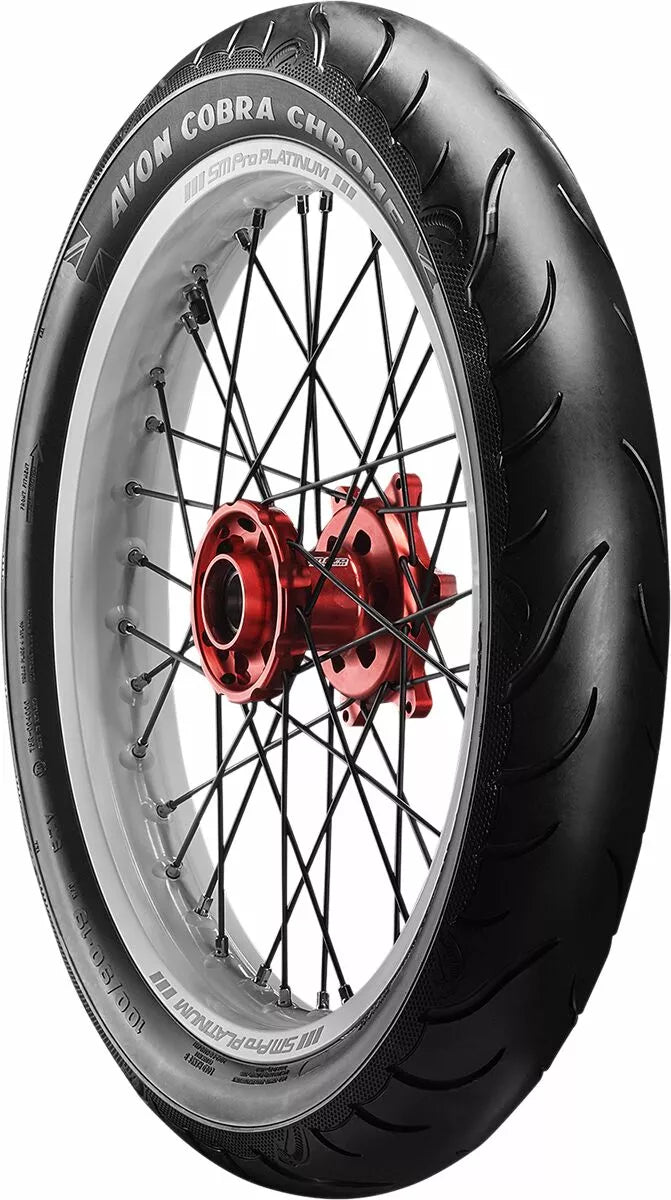 Avon's Latest Tech Pattern and Advanced Construction Produces Over A 5% Larger Footprint Compared To Avon Cobra, High Stability In All Conditions Deliveness Precise Feel and Tire Feedback, Better Traction and Shorter Stopping Distances, Even in the Wet, Incorporates Sports Tirive Longevity ヨ Perfect for Touring, Unique Tire Design with Detaileled Aesthetic Features, Improved Tire Life Over ITS Precessor, Snakeskin-Effect Treat, Reinforced, Aimed at the Power Cruiser/Touring/Custom Market.