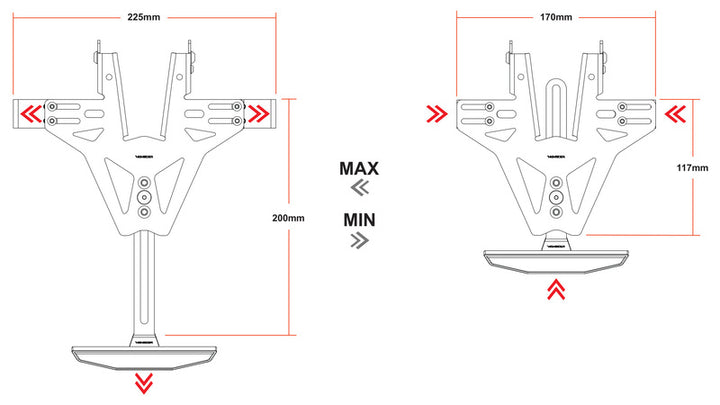 Made from 2 mm laser-cut steel plate with a black powder coat for long durability and resistance to weather and road conditions. The tilt of the plate is infinitely adjustable and secured with an extra locking screw. The adjustable turn signal holders have 10 mm side-mounted holes, allowing you to mount your turn signals without disconnecting the wires – it doesn't get any easier than this.