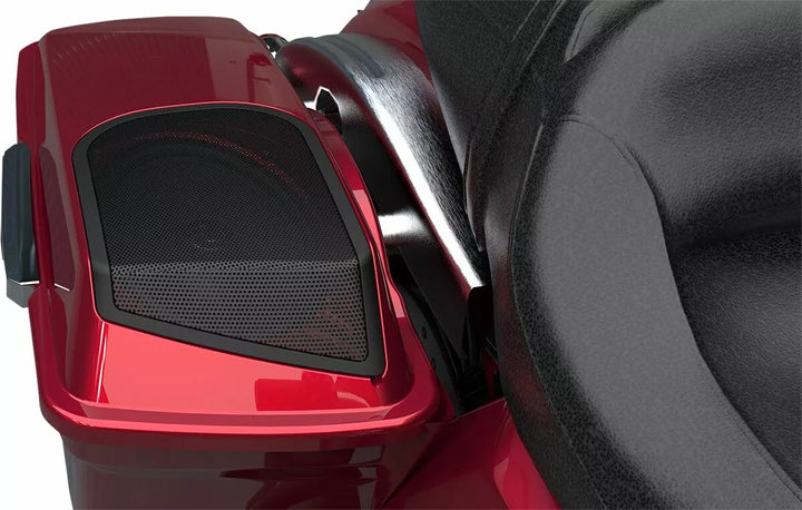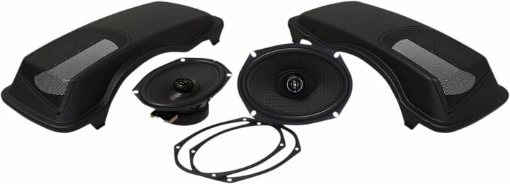 Speakers angled toward rider for best sound, Includes 200 watt 2 ohm XL Series 6x9ヤ speakers made for motorcycle environment (200 Watts per speaker), Built-in water drainage system keeps everything dry, High quality/high impact ABS replacement saddlebag lids, Comes matte black, primed and Ready for Paint, Metal Mesh Grills, Gaskets, Striker Plates, Grommets, Wire Harness and All Required Hardware Is Included, Included Wire Harness Will Plug Into Any Current Hogtunes amp or Other amp, Works With Oem and Most Latchas