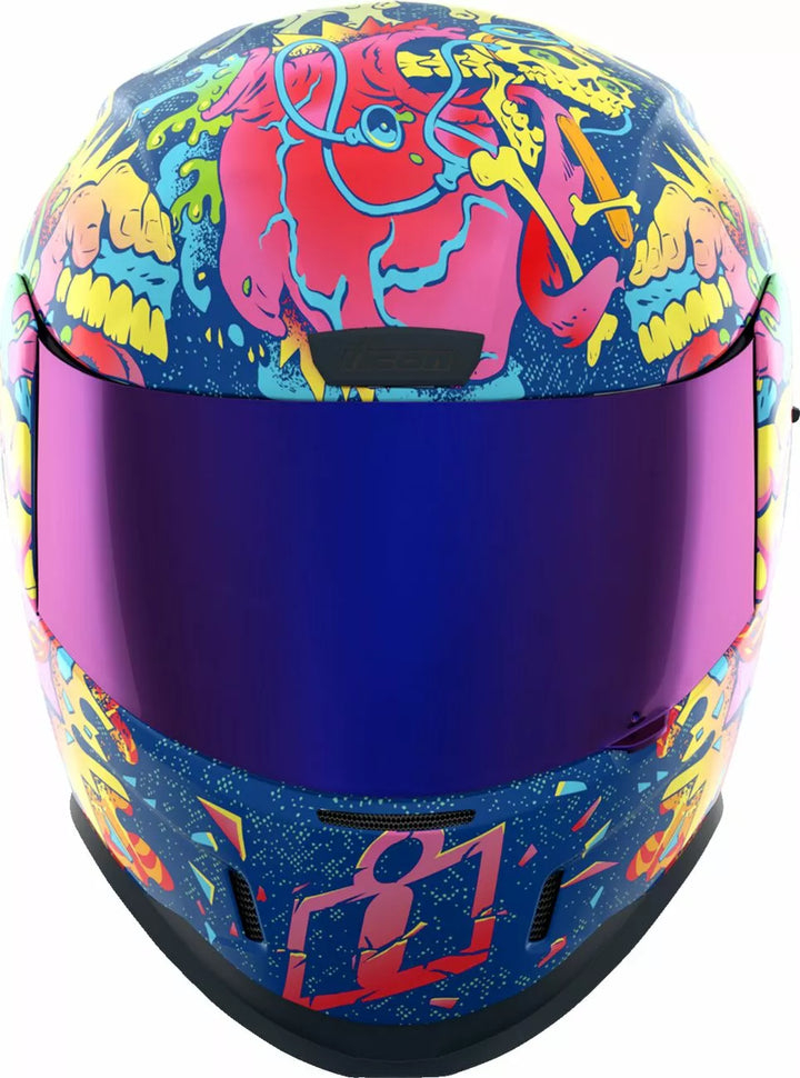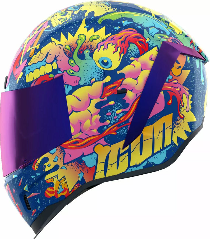 Injection Molded Polycarbonate Shell for Strength, Internal Airflow Geometry, Continuous Venting System, Sculpeed NECK Roll, FAG-FREE ICON OPTICS ™ Shield with Rapid-Reale ™ System, Prock ™ Positive Shield ™ Writing System, Internal Drop High Visor must only be used while the main face shield is in the fully closed position, removable Molded Breath Deflector, Removable Hydradry ™ 3-Piece Moisture Wicking Liner, Internal Speaker Pockets Work With Icon's R.A.U. Bluetooth Device, Includes Dark Smoke Dropshield, Includes Clear & RST Purple Optics Shield ™