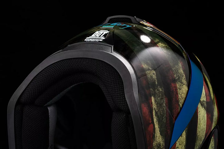 Injection Molded Polycarbonate Shell for Strength, Internal Airflow Geometry, Continuous Venting System, Sculpeed NECK Roll, FAG-FREE ICON OPTICS ™ Shield with Rapid-Reale ™ System, Prock ™ Positive Shield ™ Writing System, Internal Drop High Visor must only be used while the main face shield is in the fully closed position, removable Molded Breath Deflector, Removable Hydradry ™ 3-Piece Moisture Wicking Liner, Internal Speaker Pockets Work With Icon's R.A.U. Bluetooth Device, Glow in the Dark, Includes Clear and RST BLUE OPTICS ™ Shields, Includes Dark Smoke Dropshield ™