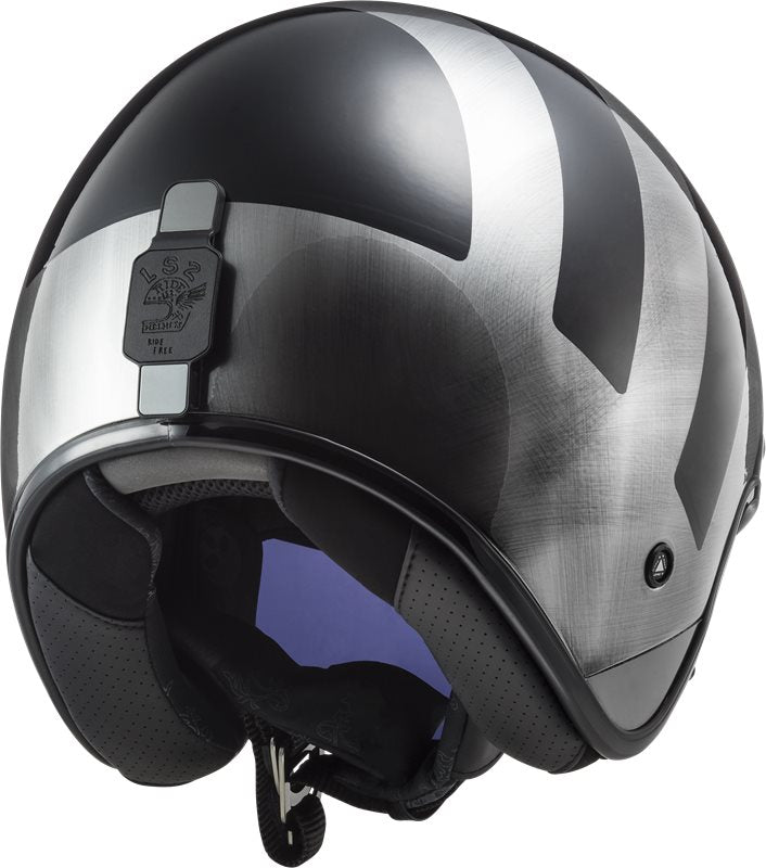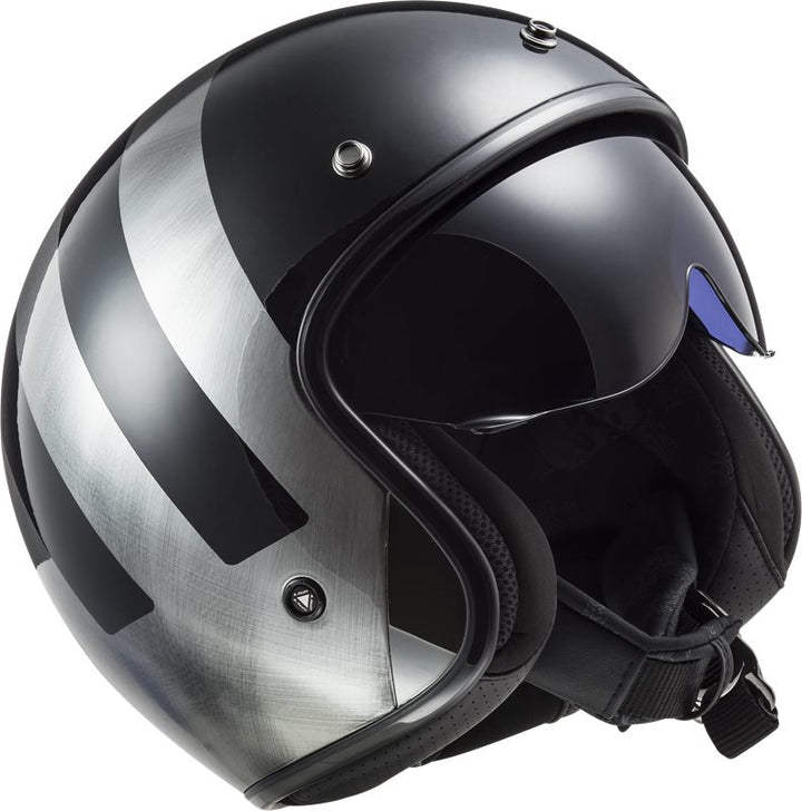 LS2 Öppen Mc-Hjälm Bob II Jeans med svart och silver design, integrerat visir och retrostil för stadskörning. Finns i storlekar XS-XXL.