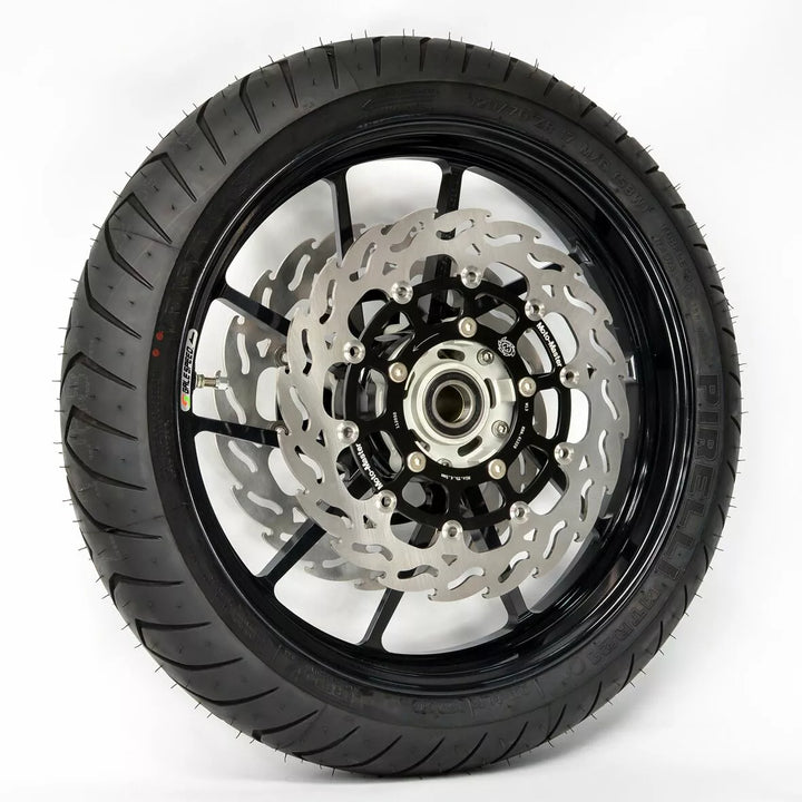 Bolt-on Performance Upgrade, Flame Design Ensures Optimal Heat Dissipation and a Perfect Cleaning of the Brake Pad Surface, Durable, Premium Quality Stainless Steel Outer Ring, Mounted with Lightweight Stainless Floaters, Electricity Rider Double-Gegrund Liver, Equal Brake Pad Contact Throughout Entire Rotation of Disc Ensures Linear Braking Action, CNC-Machined 6082 Billet Aluminum, Black Anodized Carrier is Lightweight and Strong, Can Be Used With Any Type of Brake Pad, Also Avaable in