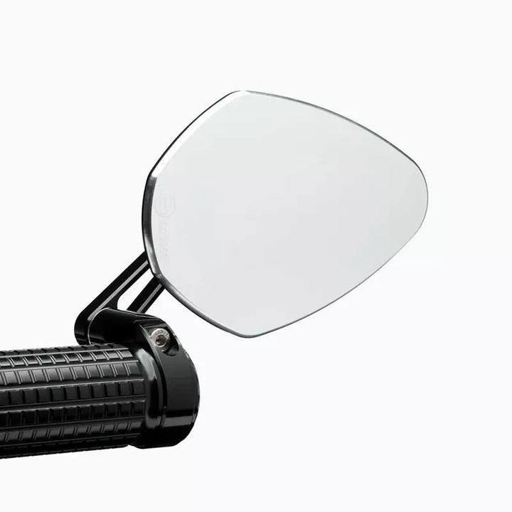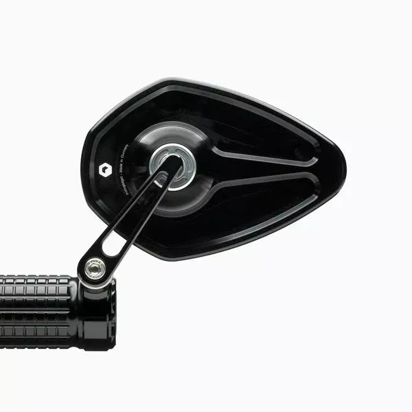 The Handlebar End Mirror with Swivel Mirror Arm and Defined Detent Angles is Perfect for Narrow Passages or Space Problems in the Garage. The Mirror Can Be Mounted Above or Below The Handlebar., Our Glasless Mirror Series Mo.view is Unique Worldwide. The Special Feature of Our Mirrors Is The Patented Mirror Surface, Which Is Made Directly From the Metal of the Body. The Aluminum Itself is the Mirror Surface!, The Mirror Body Itself is Very Thin and Light, Creating a Weightless Design Without a Rim or Frame. The Convex Mirror Surface Is Produced by Fly Cutting Using Diamond Tools On Ultra-precision Machines in Berlin. It is then made resistant to oxidation, corrosion and abrasion by an elaborate plasma coating in a vacuum., The mirror body, mirror arm and the clamp for the handleable end are milled from solid aluminum on cnc machines and anodized to a high quality. All Screws are Made of Stainless Steel. The precise ball joints the mirror to be adjusted Comfortable and very stable. Glass Breakage or Glass Falling Out is Simply Not Possible!, A Special Feature of the Flip Series Mirrors Is The Pivoting Mirror Arm With Defined Locking Angles at 45 ° Intervals. This Allows the Mirror to Be Tilted Upwards As Required Without Changing the Mirror Setting., Extremely Practical for Narrow Passages, Space Problems in the Garage or for Transportation. The Locking Mechanism is Very Stable and Cannot Be Adjusted Accidentally. The Mirror does not vibrate, even at high speed, IF fitted correctly., The Mirror Can Be Mounted Both Above or Below the Handlebar and Is Suitable for the Right and Lift Side. Mounting is directly on the end of the handlebar (22 mm and 1 inch) or if the grips and fittings can not be moved, using a mo.view bar adapter., Mirror body width: 122 mm., Mirror Body Height: 83 mm. Mirror Arm: 72 mm., Clamp Diameter: Can Be Used for 22 mm and 1 inch Handlebars., CLAMP WIDTH: 12 mm., Weight: 150 g., Scope of Delivery: 1x Mo.view Sport 60 Flip (With Ece Marking) With Arm, 1x CLAMP & INSTRUCTIONS MANUAL.
