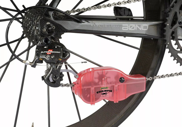 The Chain Pig II Provides A Simple, Efficient, and Effective Way to Clean The Chain Without Making a Mess or Wasting Valuable Degree., The Upper and Lower Bodies Are Made From Super-Strong, Chemic and Impact-Resistant Steel Plastic and the Chain Pig Pig Other Improvements, to Further Increase Durability., The Brush Wheels, which have the Toughest Job in any Chain Cleaner, Feature Larger Diameter Bristles Optimized for Stiffness, Effective Cleaning Performance, and Duability. Stage One Brushes Pull Degreaser Up From The Reservoir and Onto The Chain., The Chain Is Then Scrubbed From All Angles and Finally Pulled Through a Large Durable Sponge that Wicks Excess and Contaminated Fluid from the chain minimizing mess Larger Contaminants, and Returned USable Degreaser Back for More Cleaning., Works on 1-13 Speed ​​Chains., Free the Chain Pig II from His Pigen and Watch Him Devour Chain Grime as Only a Pig Can! The Pigen Contains The Chain Pig, A Bottle of Degreaser/Cleaner (20 ml), a Bottle of Dry Lubricant (20 ml) and a Gear Brush!