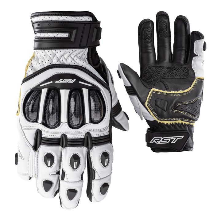 The glove is made of both whole grain's cowhide and kangaroos and has a CE level 1 Carbon Knuckle Protector for shock protection. DUPONT ™ Kevlar® fiber on palm and substrate, together with double layer kangaroos and an RST palm control protects the palm in the event of high-speed slide. Elastic joined fingers to prevent "finger roll" without affecting range or flexibility when replacing gear and hook and loop closure provides a safe fit.