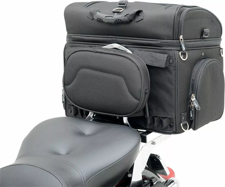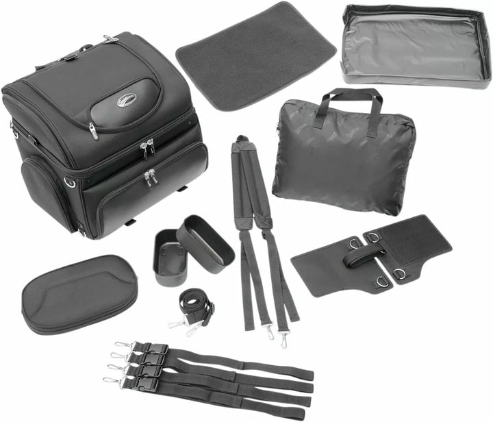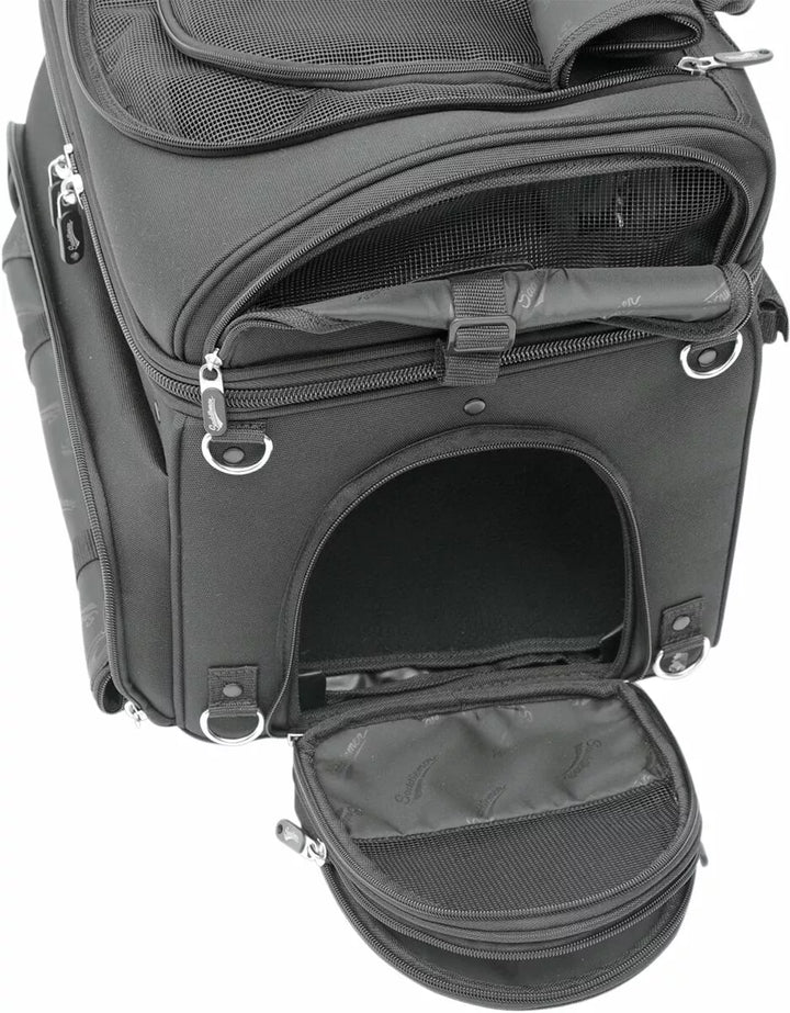 Best way to carry your small pet on your motorcycle in comfort, plus this carrier doubles as an effective cargo bag, multiple vents and access flaps let you vent frresh air to your pet while providing easy and spaw botom Pad for Your Pet's Comfort; Includes Food and Water Trays That Stow Neatly in their Own Compartment, Two Mounting Systems Included; A Saddlemen Versa-Mount Seat Harness or Adjustable Sissy Bar Strap System Easily Attaches The Bag To Your Motorcycle's Seat, Luggage Rack or Sissy Bar, Quick-Disconnect Mounting Straps and Sissy Bar Sleeve Allows The Bag To Be Removed FROM YOU MOTO You can position for your, or your passenger's, Riding Comfort, Convenient Liner Bag With Carry Handles Lets You Store Clothes Or Cargo Away From Your Pet Or Other Bag Contents, Sturdy Grip Handle For Convenient Carrying - Included Backpack Strap Pack Pack Pack Pack Freedom of Movement While Keeping Them Secured in the Bag; Comes with a short internal leash and a long walking leash for pet Pit stops, pet Compartment Measures 16 "W x 14" L x 14 "t (3,200 cu. In. Capacity), please note dimensions of this bag to even proper fit for your pet.