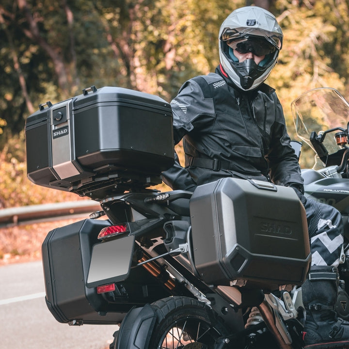 Terra TR55 Black Edition Top Case Has Capacity for Two Flip-up Helmets and Stands Out It is the Lightest Aluminum case on the market at 5.4 kg. Designed and made 100% in Barcelona. Its Innovative Design Minimises Visual Impact On The Motorcycle. The Terra Black Edition Version is finished with scratch resistant Matt Black Paint. The Terra TR55 Top Case has been awarded with the abc awards, Thanks to its design Focused on Solving Key Aspects for the use on adventure motorcycles. It has an Aerodynamic, Integrated Structure Made from a hardened aluminum alloy, a stronger and light of aluminum which deeds a reduced cross section of 1.2mm to obstain minimum weight with maximum resistance. As with all terra aluminum cases, the 'terra lid system' (patent pending) is included. With an AISI 304 Industrial Grade Stainless Steel Structure Which Includes The Lock System and a Retractable Carrying Handle. This Structure was designed for Quick, One-hand Usage and Allows the User to Open, Close, Remove, and Transport The Case Within Seconds. AISI 304 Stainless Steel Hinges Are Also Available. The Case's Rubber Sealed Frame Protects The Interior From Unfavourable Weather Conditions (Water Resistance). In Addition, The Inner Foam Base Reduces Movement of the Load Inside. The Keys and Lock cylinder of the tr55 are the premium version from shad, with a system that reduces the chance of theft, as well as a cover that stops dust from entering. There is the option to add Additional Load Thanks to its External AISI 304 Stainless Steel Hooks. The Installation of a Shad Top Master and a Mounting Plate (Not Included) Are Required. There Are Three Mounting Plate Options: Shad Standard Plate (D1B591PA), Aluminum Mounting Plate (D1BTRPA), or the Black Aluminum Mounting Plate (D1BTRPA2). The Lock Cylinder's Are Easily Changed: Top and Side Cases Can Be Unified for Use with One Key in Less Than 5 minutes. A Third cylinder is included for the top case in the right-side case. Accessories (Not Included): Two-Piece Backrest (D0Ri75) and Expandable Inner Bag (X0IB10).