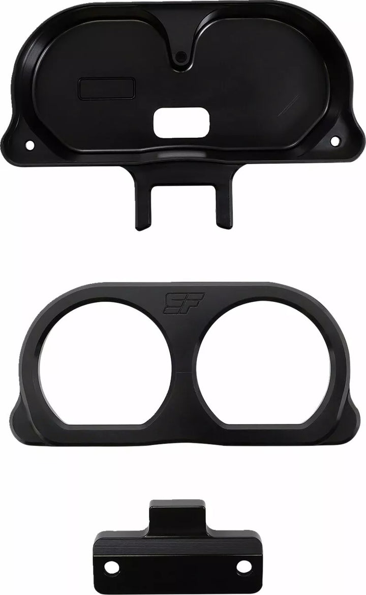 Specific-fit to slyfox risers with top mount bracket (risers sold separately), can mount in front or back of risers, adjustable tilt, compatible with stock gauges and dakota digital gauges for models/years listed, made in the USA