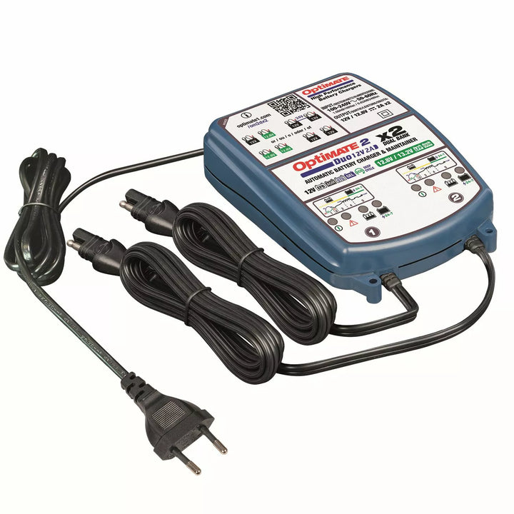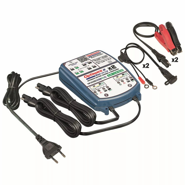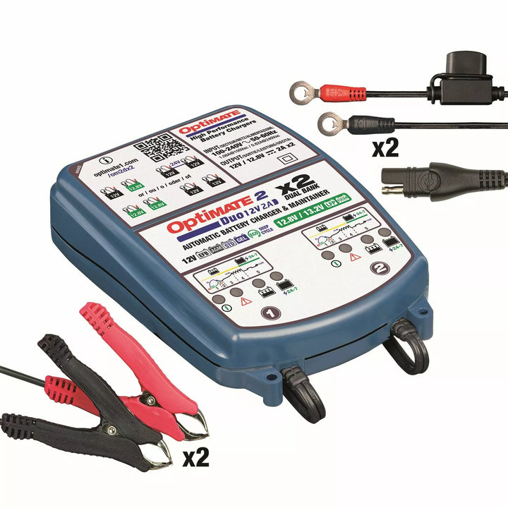 OPTICATE 2 DUO X 2 Bank Bronze Series: 5-STEP 12V / 12.8V 2A Sealed Battery Maintainer X2., The Powerful 'No Brain' 2-Bank Battery Mainainer for the Hi-Technology Battery In any of your Vehicles. Guarantees Healthy Lithium or Lead-Acid Battery!, Ideal for 2x 12V Lead-Acid & 12.8V / 13.2V Lithium LFP (LifePo4) Batteries., Independently Charge, Test and Maintain 2 x 12V LEAD LAG (STD, GEL) Batteries. Batteries are Always Ready to Perform., Delivers 2 Amps Charge Current Recommended for Maintenance of Larger Batteries., Charges and Delivers Long Term Maintenance. Connect to the Battery and Optime 2 Duo Dual Bank does the Rest, No Supervision Required!, DUO: Adapts Automatically to PB or LFP Battery., Safe to Leave Connected. Full Electronic Protection., 24/7: Maintains Battery at Full Charge and Good Health., Low Volt Start of 4v., Warn Battery Damage is detected., Green Technology: Energy Saving Technology. Stand-by Power Less Than 0.5W and Efficient 24-7 Battery Maintenance., IP54: Weatherproof. Rated for use down to -40 ° C / -40 ° f.