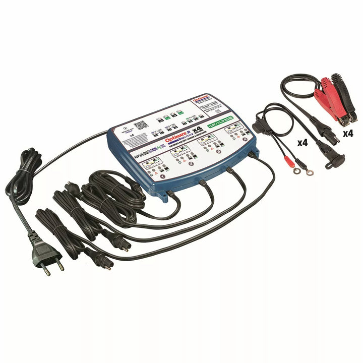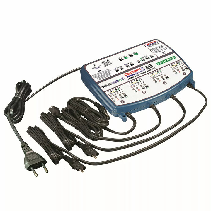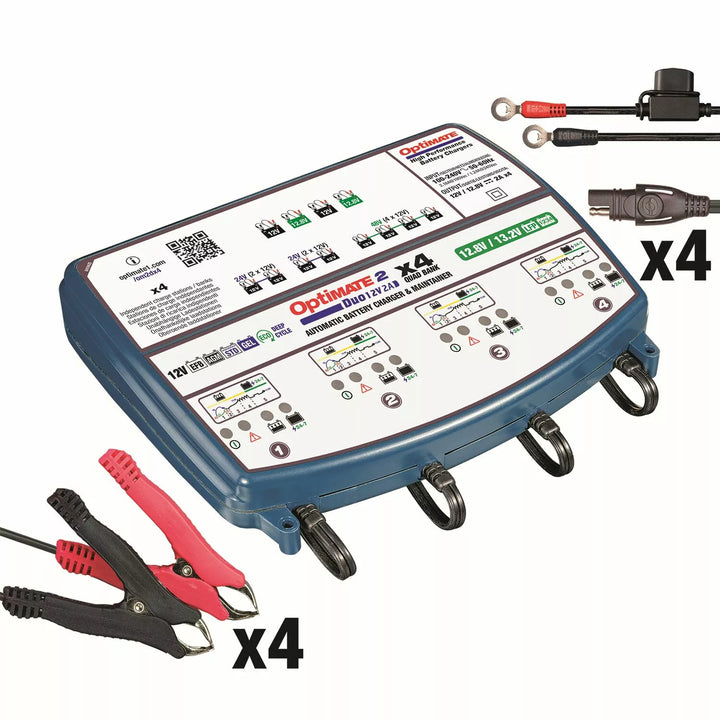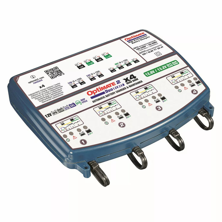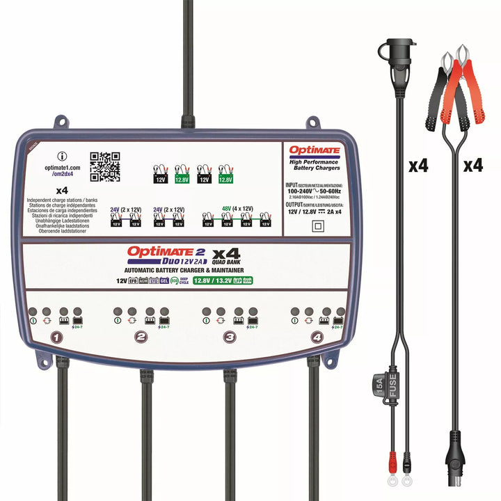 OPTICATE 2 DUO X 4 Bank Bronze Series: 5-STEP 12V / 12.8V 2A Sealed Battery Maintainer X4, The Powerful 'No Brain' 4-Battery Mainainer for the Hi-Technology Battery in any of your Vehicles. The Dealer's Choice for Busy Workshops!, Ideal for 4x 12V Lead-Acid & 12.8V / 13.2V Lithium LFP (LifePo4) Batteries., Independently Charge, Test and Maintain 4 x 12v Lead-acid (std, agm, gel) / 13.2 Batteries are Always Ready to Perform., Delivers 2 Amps Charge Current recommended for Maintenance of Larger Batteries., Charges and Delivers Long Term Maintenance. Connect to the Battery and Optime 2 Duo Quad Bank does the Rest, No Supervision Required!, DUO: Adapts Automatically to PB or LFP Battery., Safe to Leave Connected. Full Electronic Protection., 24/7: Maintains Battery at Full Charge and Good Health., Low Volt Start of 4v., Warn Battery Damage is detected., Green Technology: Energy Saving Technology. Stand-by Power Less Than 0.5W and Efficient 24-7 Battery Maintenance., IP54: Weatherproof. Rated for use down to -40 ° C / -40 ° f.