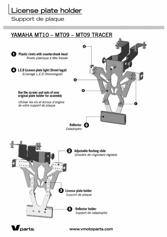V PARTS license plate holder are manufactured in France. Inconspicuous and perfectly finished, they are specifically developed for the attached bike application list. 2mm thin but sturdy steel license plate holder Black epoxy painting CNC Manufactured – laser cut: precise finish Holes to fix license plate, indicators and license plate lighting Made in France Contents: Street legal license plate lighting, EU certified Adjustable reflector plate Reflector, EU certified More info: Optimized and discreet cable passageway Fast & easy mounting Adjustable indicators brackets Fits EU plates Indicator lights spacing: 170 to 220mm Color: Black Material: Steel