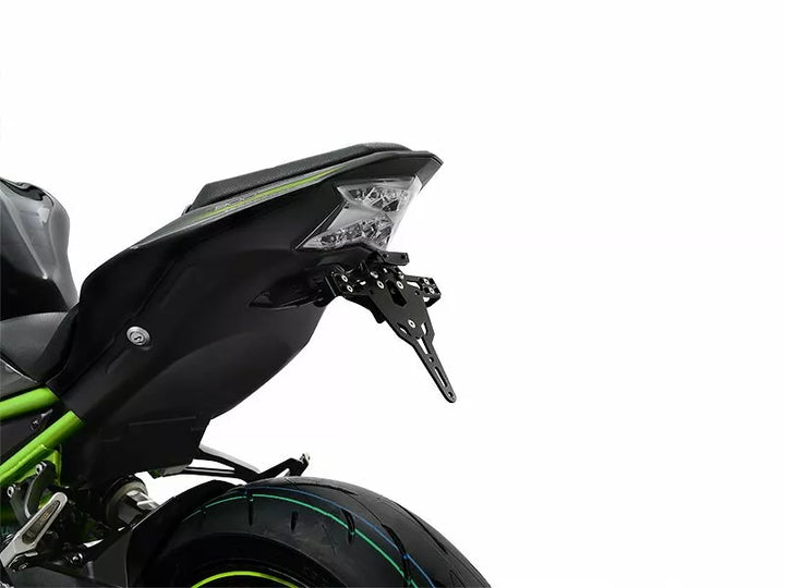 The License Plate Holder is Extremely Durable and Weather Proof., Black Powder Coated. , The License Plate Holder Can Be Used For Any Kind of License Plate (175mm Width)., No Modification of Fairing Required., Stepless Adjustment of Rake Angle., Indicator Support Adjustable in 3 Positions. Plate., Special Indicator Light Mounts (Sold Separately) Required for Stock Indicator Lights., Kit Includes: 1 License Plate Holder Incl. Mounting Kit., LED License Plate Light "E Approsved" Incl. Support., Back Light With Support. Of: Germany, Slovenia, Croatia & UK.