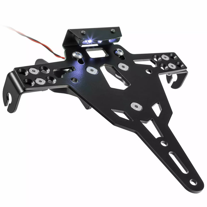 The License Plate Holder is Extremely Durable and Weather Proof., Black Powder Coated. , The License Plate Holder Can Be Used For Any Kind of License Plate (175mm Width)., No Modification of Fairing Required., Stepless Adjustment of Rake Angle., Indicator Support Adjustable in 3 Positions. Plate., Special Indicator Light Mounts (Sold Separately) Required for Stock Indicator Lights., Kit Includes: 1 License Plate Holder Incl. Mounting Kit., LED License Plate Light "e Approved" Incl. Support., Back Light With Support.