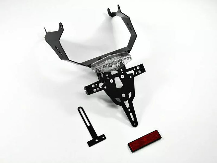 The License Plate Holder is Extremely Durable and Weather Proof., Black Powder Coated. , The License Plate Holder Can Be Used For Any Kind of License Plate (175mm Width)., No Modification of Fairing Required., Stepless Adjustment of Rake Angle., Indicator Support Adjustable in 3 Positions. Plate., Special Indicator Light Mounts (Sold Separately) Required for Stock Indicator Lights., Kit Includes: 1 License Plate Holder Incl. Mounting Kit., LED License Plate Light "e Approved" Incl. Support., Back Light With Support.