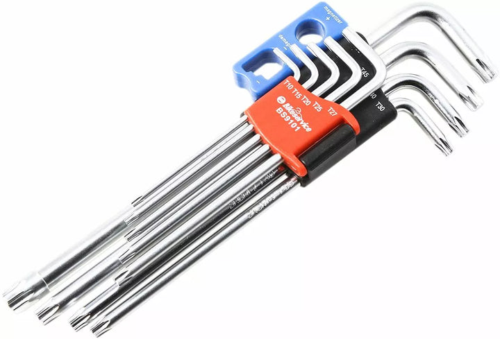 Hosszabb hosszúságú kulcsok a további tőkeáttételhez és a meghosszabbított eléréshez, a kulcs egyéb végét a TX-Star Méretekhez tervezték: T10, T15, T20, T25, T27, T30, T40, T40, T45 és T50
