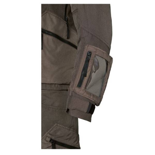 A kabátot egyben készítik Rendkívül tartós és szellőztető poliamid gémszövet, ami melegebb hőmérsékleten tartós és kényelmessé teszi. Eső és hideg esetében külön volt Vízálló GORE-TEX® külső kabát (Vízálló 28 000 mm), amelyet könnyen húzhatnak a külső oldalon, hogy teljes védelmet biztosítsanak a szél és a nedves ellen.