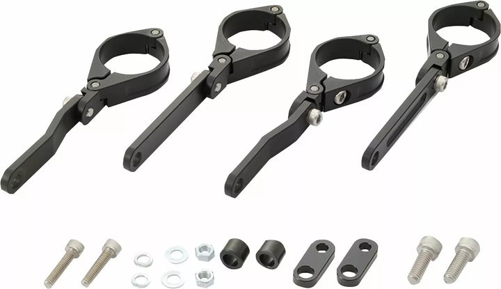 Állítható kettős tengelyes fényszóró konzol, CNC-vel megmunkált alumíniumból, fekete színben, a villa bilincset függőlegesen beállítható, lehetővé téve a fényszóró helyzetének beállítását az első hátradőleges M8 jelző szerelt készletben a diszkrét telepítéshez.