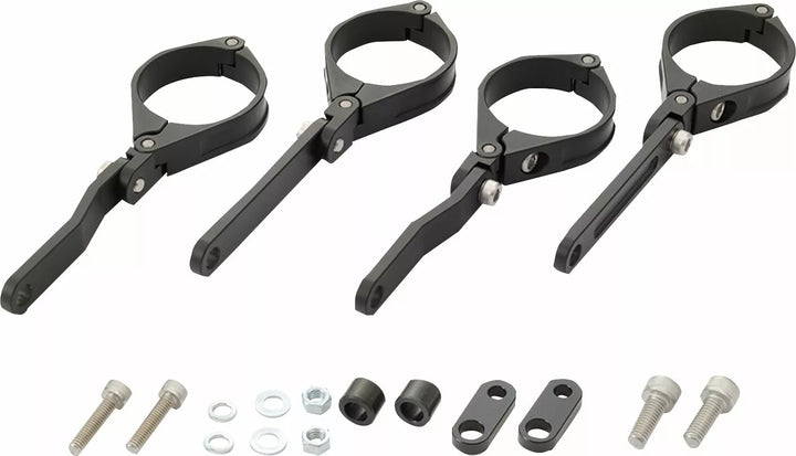 Állítható kettős tengelyes fényszóró konzol, CNC-vel megmunkált alumíniumból, fekete színben, a villa bilincset függőlegesen beállítható, lehetővé téve a fényszóró helyzetének beállítását az első hátradőleges M8 jelző szerelt készletben a diszkrét telepítéshez.