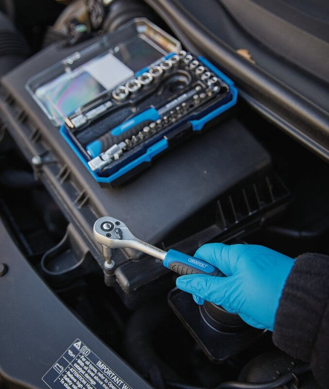 Ez az 1/4 "négyzetméteres Dr. Socket készlet tartalmaz egy 146 mm-es 72-es reverzibilis gyorskiadású racsnis-t, valamint egy választékot, valamint a csavarhúzó biteket és a hexakulcsokat. A készlet összes szerszáma csípőcsoportot gyárt az extra markolathoz. A racsnis és a fonógép mindkettő lágy tapadással rendelkezik a hozzáadott kényelemhez.