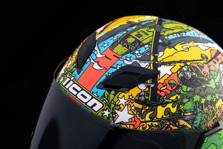 Gyorsváltozású ködmentes Fliteshield ™ oldalsó táblákkal, fröccsöntött polikarbonát héj az erősség érdekében, többszörös túlméretezett beviteli és kipufogónyílások, ködmentes DropShield ™ külső kapcsolóval, eltávolítható, eltávolítható penész. Felügyelő hűtőrendszer, a belső hangszóró zsebek működnek az Icon R.A.U. A Bluetooth eszköz, a DropShield ™ Visort csak akkor szabad használni, amikor a fő arcpajzs teljesen zárt helyzetben van, eltávolítható Hydradry ™ nedvességkivágó bélés, amely magában foglalja a Clear Fliteshield ™ és a Dark Smoke Smokes Deps -t.