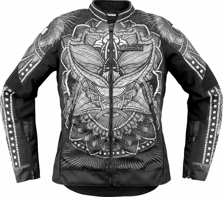 Női Overlord3 Noble ™ kabát Allover grafikával, amelynek 1680D és 300D poliészter alvázára és belső 300D poliészter-megerősítésére nyomtatott, Icon® Women's Sport illeszkedő karokkal és alakú testtel illeszkedik, D30 Pane Mesh Certs, Protector; Könyök és vállhatások védelmezői, eltávolítható szigetelt mellény bélés, hátvédő EN 1621-2 1. szint