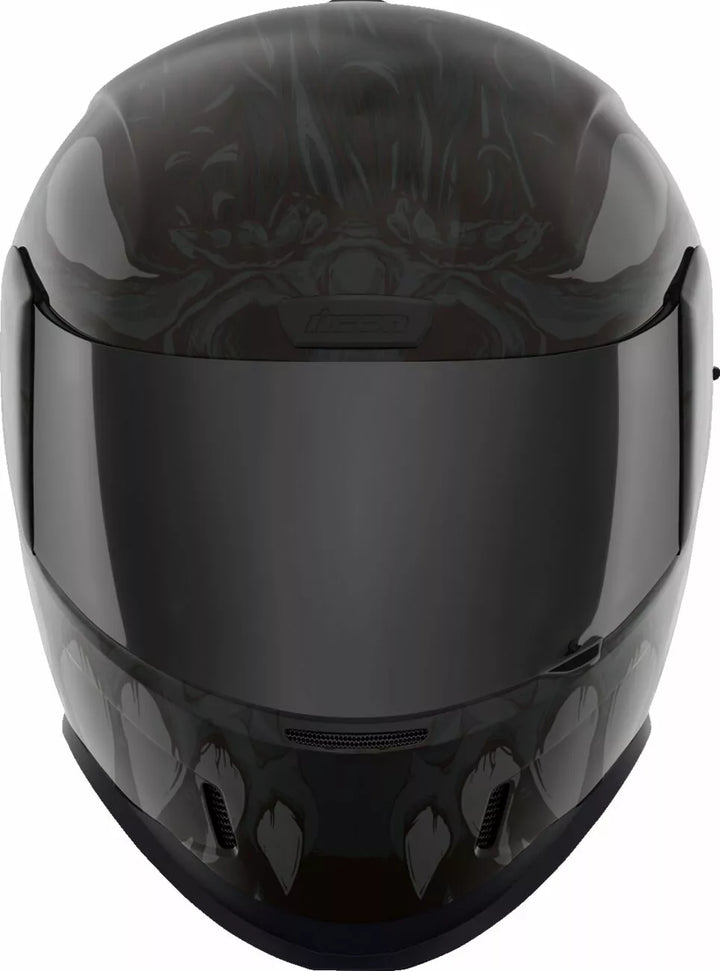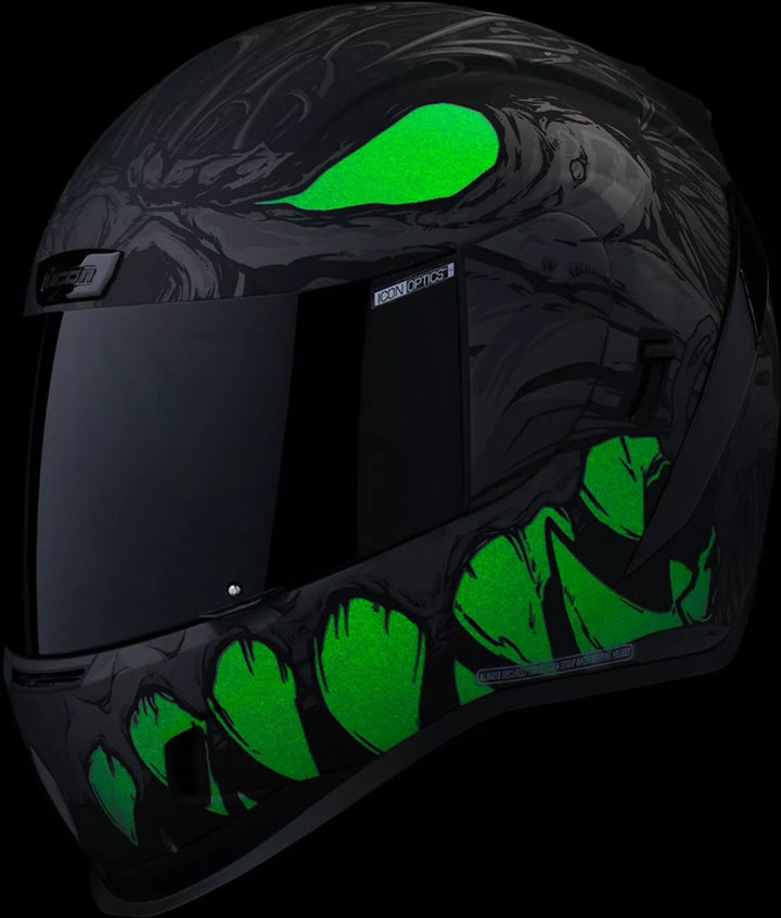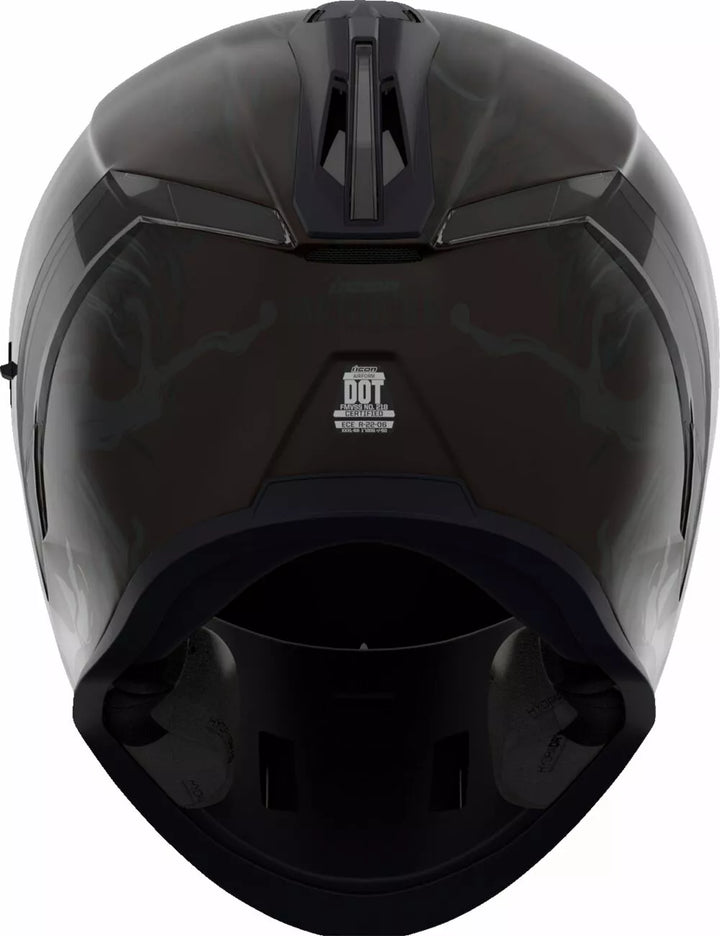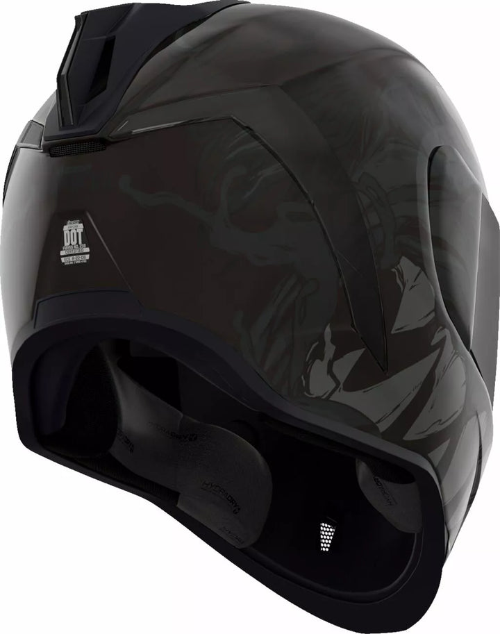 Folyamatos szellőztető rendszer, FAG-mentes ikon Optics ™ pajzs gyorskiadású ™ rendszerrel, fröccsöntött polikarbonát héj, belső légáramlás geometria, faragott nyaki tekercs, prolock ™ switsch, a reteszelő swequeves visorral, csak akkor használható, ha a fő arcpajzs nedvesen le lehet zárni, eltávolítható, eltávolítható légzőkészüléket, távolítható, távoli vízszülött, míg Bélés, belső hangszóró zsebek működnek az Icon R.A.U. A Bluetooth eszköz magában foglalja a Dark Smoke DropShield ™ -et és a Rubatone Black Speedfin ™ -et