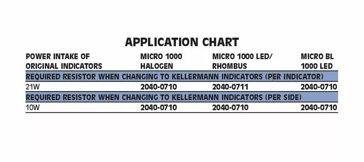 , Mikro 1000 DF és egy fényvezérlő izzó használatakor egy további ellenállás 33 ohm sebességgel (2040-0712 rész) a hátsó lámpához, és egy további ellenállás 7,5 ohm-on (rész #2040-0711 rész) szükséges a féklámpa számára.