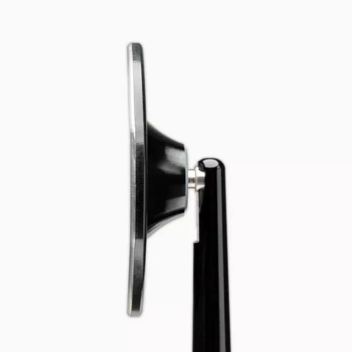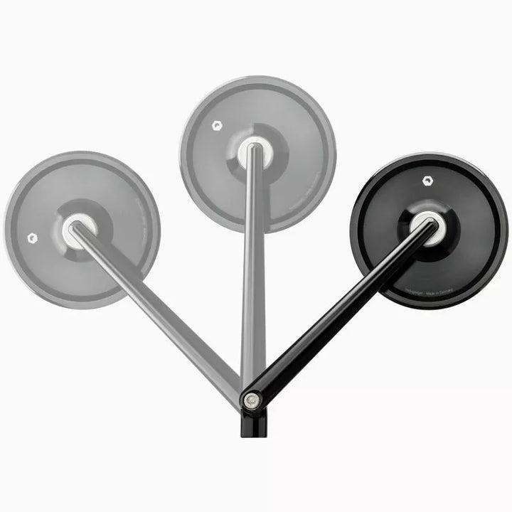 A tükör forgó tükörkarral és 45 ° -os reteszelő szöggel tökéletes keskeny átjárókhoz, szállítás során, vagy ha a garázsban vannak űrproblémák. A tükrök különleges jellemzője a szabadalmaztatott tükörfelület, amelyet közvetlenül a test féméből dolgoznak. Maga az alumínium a tükör felülete. Maga a tükörtest nagyon vékony és könnyű, súlytalan kialakítást hozva létre perem vagy keret nélkül. A konvex tükörfelületet légyvágással állítják elő, gyémántszerszámok segítségével a berlini ultra-precíziós gépeken. Ezután az oxidáció, a korrózió és a kopás ellenállása egy komplex plazma bevonatnak vákuumban. Minden csavar rozsdamentes acélból készül. A pontos gömb úgy illeszti össze, hogy a tükör kényelmes és nagyon stabil. Üvegtörés vagy üveg leesik egyszerűen nem lehetséges. Ez lehetővé teszi a tükör felfelé történő megdöntését a tükör beállításának megváltoztatása nélkül., Rendkívül praktikus a keskeny átjárókhoz, a garázsban lévő űrproblémákhoz vagy a szállításhoz. A reteszelő mechanizmus nagyon stabil, és nem állítható véletlenül. A tükör még nagy sebességgel sem rezeg, ha korraktálisan szerelhető fel. Három különböző szálú rögzítőcsavart szállítunk. A tükör a bal és a jobb oldalra alkalmas, a tükör test átmérője: 99 mm, a tükör test vastagsága golyófej nélkül: 4,5 mm, a tükörkar hossza: 150 mm, súly: kb. 300 g