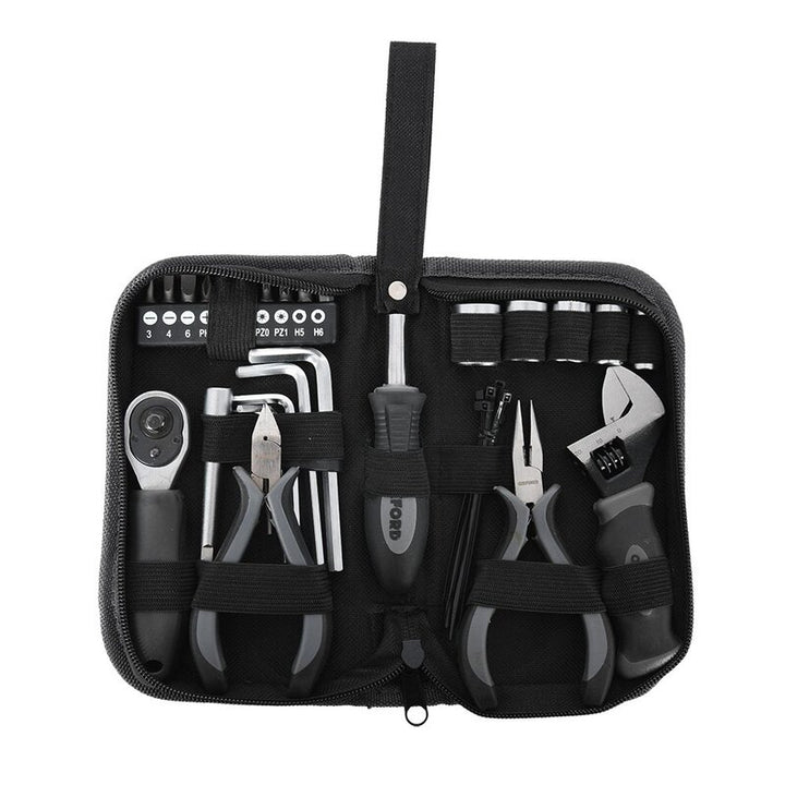 Az Oxford Tool Kit Pro egy átfogó 27 darabos prémium motorkerékpár -készlet. A puha gélfogantyúk biztosítják, hogy a szerszámok kényelmesek legyenek, és mindegyiket a helyén tartja egy ragasztó, rugalmas hevederrel egy kompakt tároló tok belsejében, ideális a hátsó ülés alatt tartáshoz. Az aljzatok, a hosszabbító és a hexakulcsok tartós króm vanádium acélból készülnek.