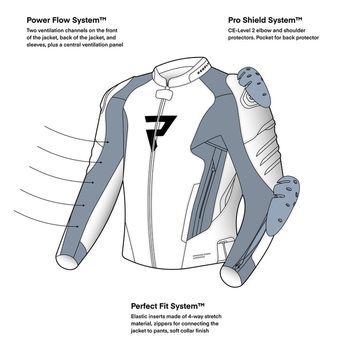 A Rebelhorn Veloce motorkerékpár -kabátja, a jól átgondolt vágásnak, a mindennapi használatra való kényelemnek és a turnénak köszönhetően azok számára, akik a bőr ruházat által kínált biztonságot részesítik előnyben. A Veloce nadrággal kombinálva kétrészes jelmezt hoz létre. A négyirányú nyújtási betétek használata biztosítja az optimális illeszkedést. A kabátnak van egy fejlett szellőztető rendszere is.