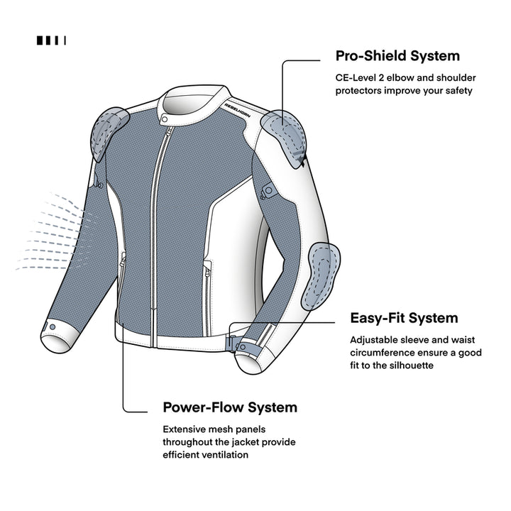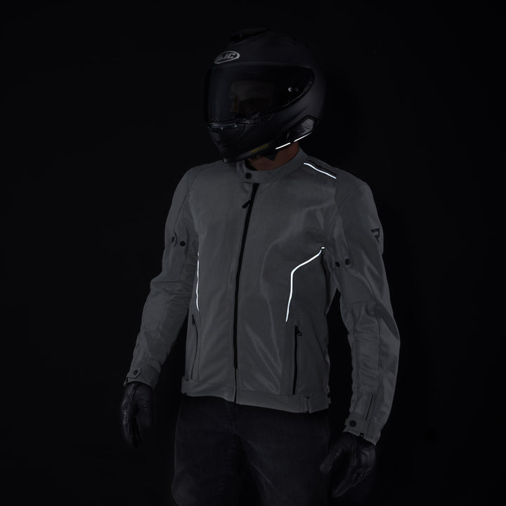 A leginkább kitett zónákba, valamint a váll- és könyökvédelembe helyezett reflex elemek felelősek a motoros biztonságáért.