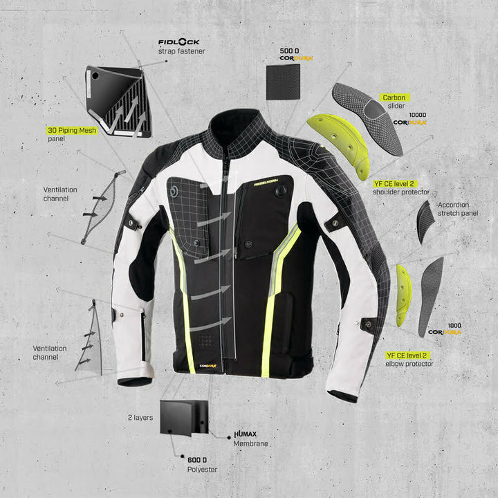 Az alkaron lévő hosszú cipzárak integrált szellőztetéssel biztosítják az optimális légkeringést. 8 szellőztetőcsatorna az elején