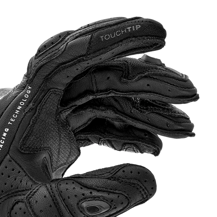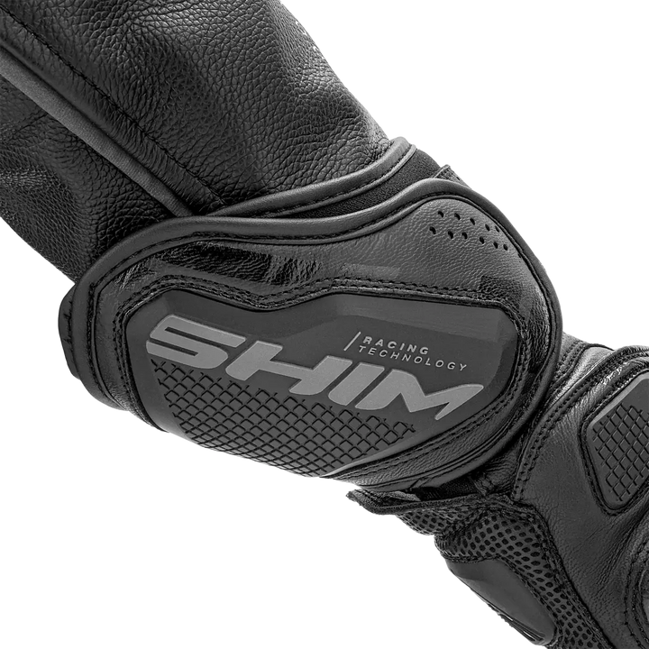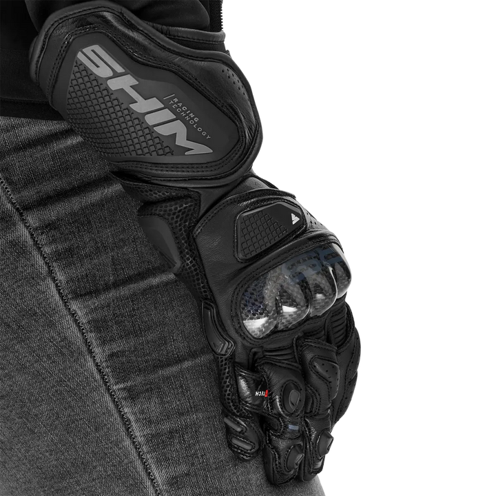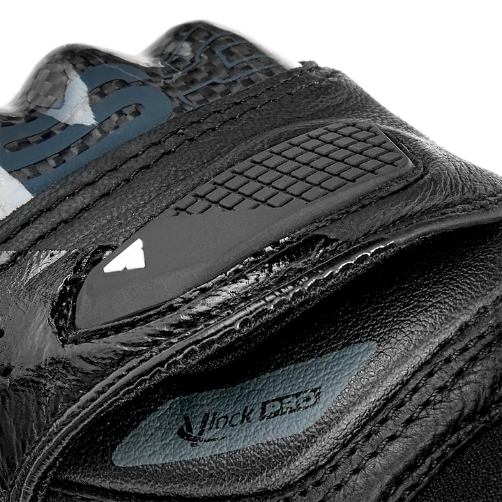 Tartós kecskebőrből készült és megerősítve Szuperlastic és tartós kenguruin a tenyérben. Töltve vannak velük szénszál megerősített csuklóvédelem, SAP kézi csúszdák, Mini csúszik a kis ujjra és Armorplus töltelék Érzékeny zónákon. Az előre alakított ujjak ujjbordával a gyűrű és a kis ujj között védik a kezét, amikor érintkeznek az aszfaltdal.