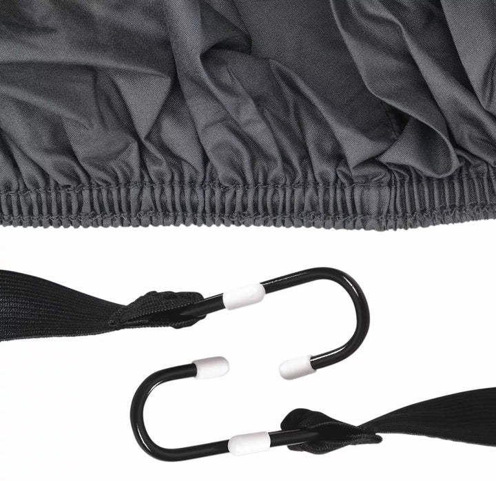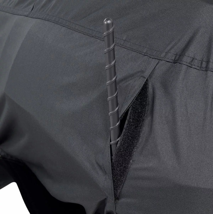 Egyedi festett, vízálló poliuretán bevonatú poliészterből készül, amely kiváló védelmet nyújt az időjárás, a szennyeződés és a szennyezés ellen. 4 elasztikus hevederrel horgokkal, amelyek segítenek a fújó széltől., Kényelmes, kompakt húros húr tároló tasak., Nagy láthatóságú logó, hogy segítse a fedett utazást sötét parkolóban., Bal és jobb Attenna hozzáférési pontok horoggal és hurok tömítéssel horoggal és hurok tömítéssel kampó tömítéssel horoggal