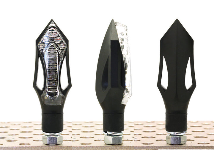 Adjon élesebb kifejezést a motorkerékpárjának V alkatrészek nyíl LED villogók -Egy pár keskeny, agresszíven tervezett villogó, modern LED -technológiával. Fekete burkolattal és tónusú üveggel szépen belekeverednek az utcai cudingtól a Custo építéséig, miközben erős és tiszta villogó fényt adnak.